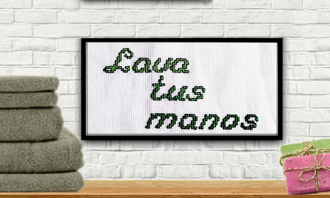Cartel con las palabras "Lava tus manos" bordado en punto cruz, medidas aproximadas: 19 cm de ancho por 10 cm de alto. Para el baño de tu hogar.
